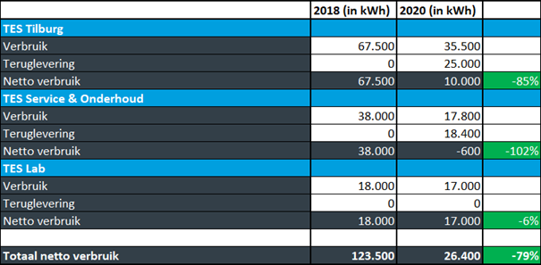 In onderstaande tabel staan de verbruikscijfers van onze drie panden in kWh. Hier staan de cijfers van 2018 (vóór het verduurzamingsproject) en 2020 naast elkaar. Uit de cijfers blijkt dat TES Service & Onderhoud al volledig elektriciteitsneutraal is. Daarnaast is het totale netto verbruik van onze panden met 97.100 kWh (79%) afgenomen.